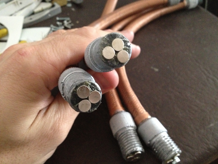 Antes de presentar todo en los pies terminé de armar las mangueras; en los pies las ajusté con un tornillo autoperforante y una arandela hecha de estireno y en las cajas de baterías las coloco con unos imanes de alto magnetismo.